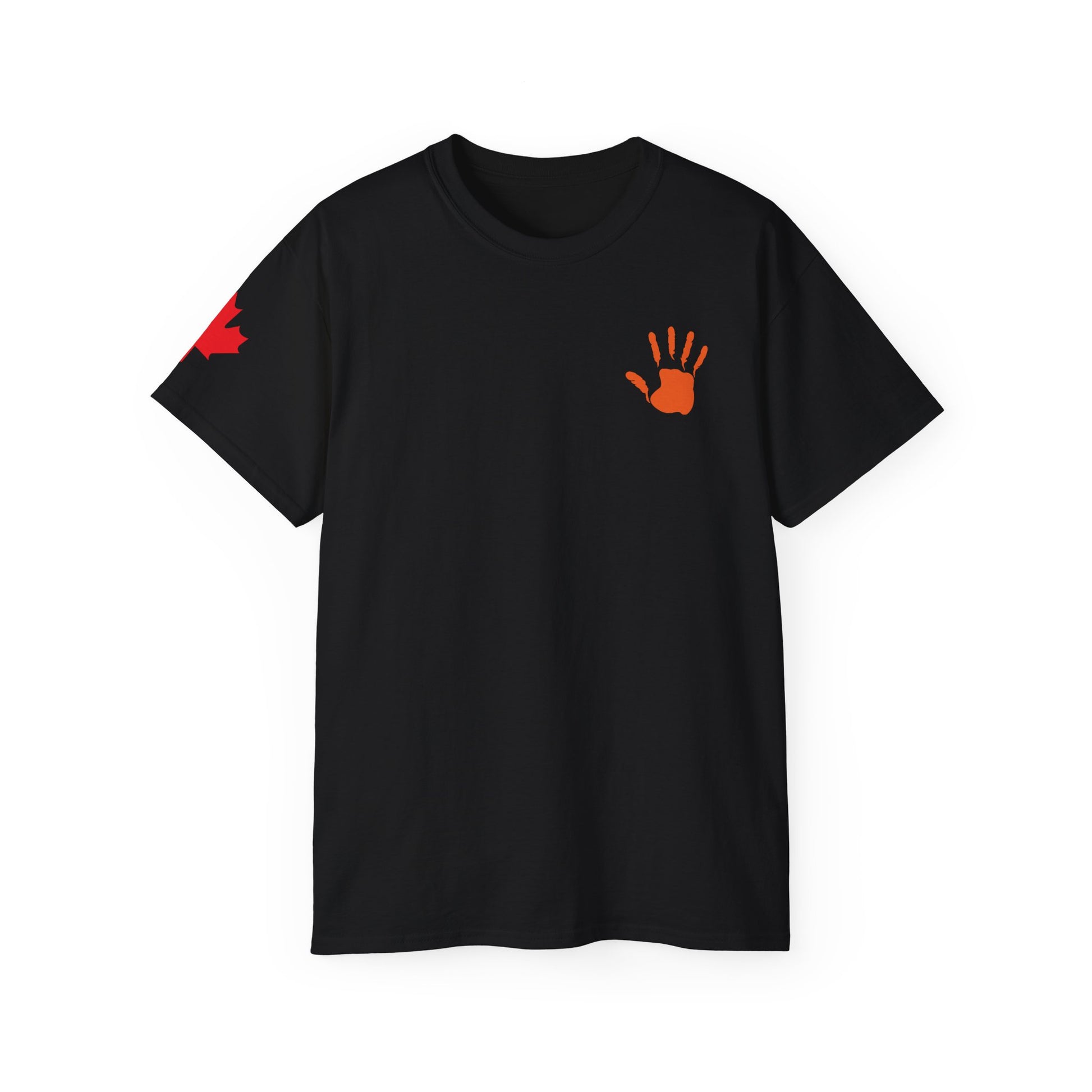 This striking t-shirt features the powerful symbol of the "Every Child Matters" hand alongside the iconic Canadian maple leaf. The design is a poignant reminder of the importance of recognizing and honoring the rights and well-being of every child. The hand, represents solidarity, compassion, and the commitment to creating a safe and inclusive environment for all children. Paired with the unmistakable Canadian maple leaf, the shirt reflects a sense of national unity and advocacy for the well-being of children in Canada.