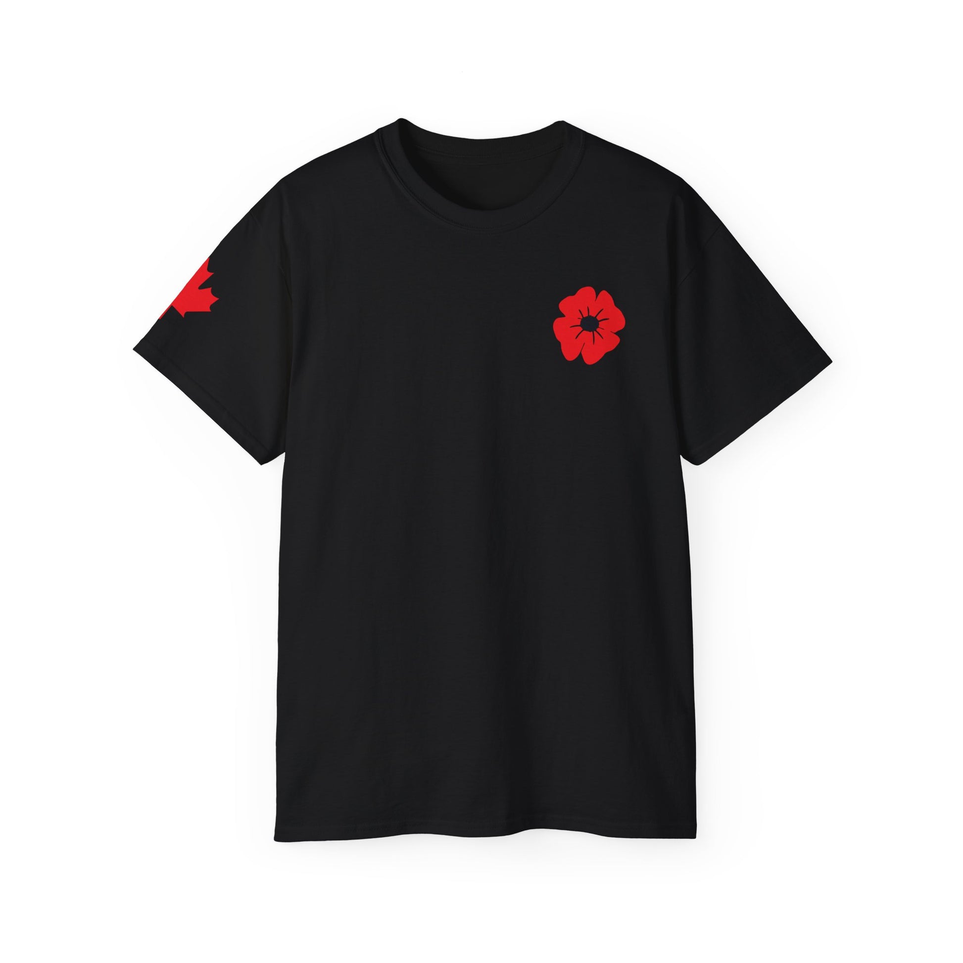 This unisex soft-style t-shirt featuring a poppy and maple leaf design combines two iconic symbols. The poppy is often associated with remembrance, and honoring military veterans, while the maple leaf stands as a prominent symbol of Canada. This unique combination not only represents a tribute to Canadian military personnel, commemorating their service and sacrifice, but represents a symbol of national pride.